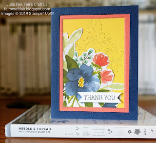 Stampin' Up! came out with a Floral Grid Paper in the last 6 months, and I just love the images on it. In fact, I love it so much that in needs to be used on a project or two! I paired the paper with the Needle and Thread Bundle, which has great floral images and stitching, which also coordinate with the Stitched Rectangles that I used to create the framed look for this card.