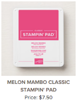 3. Stamp the small flower in the center of the large Melon Mambo flowers on Layer 3. Again, you can make lighter images by stamping a second time before re-inking. Also stamp the small flower cluster between the melon mambo flowers to fill in any spaces using Night of Navy Ink.